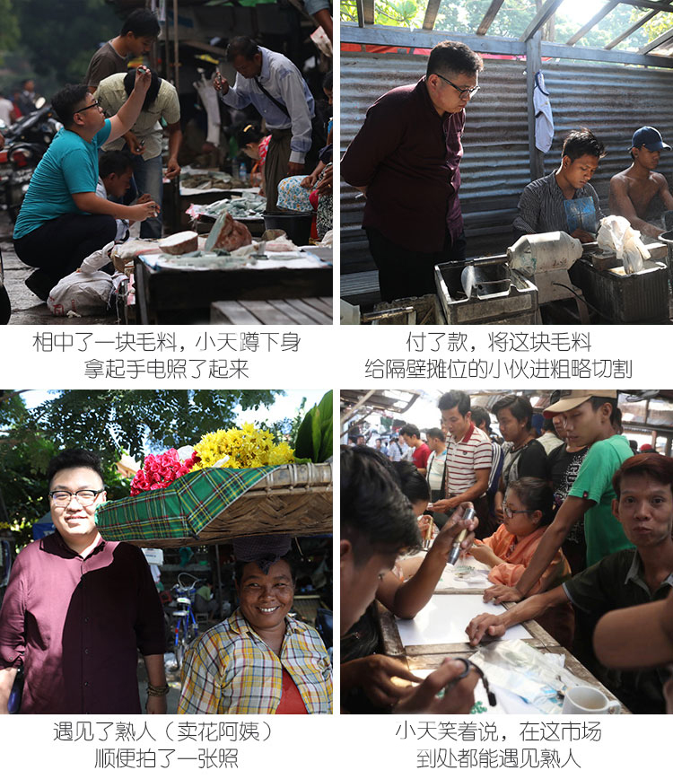 在缅甸的各大翡翠毛料市场上,经常会看到一个小伙,拿着一把手电筒,在石头毛料之间照来照去,操着东北口腔的缅甸语,跟“老缅”交谈着石头的价钱,他就是被翡翠界称为“翡翠高手”的小天。